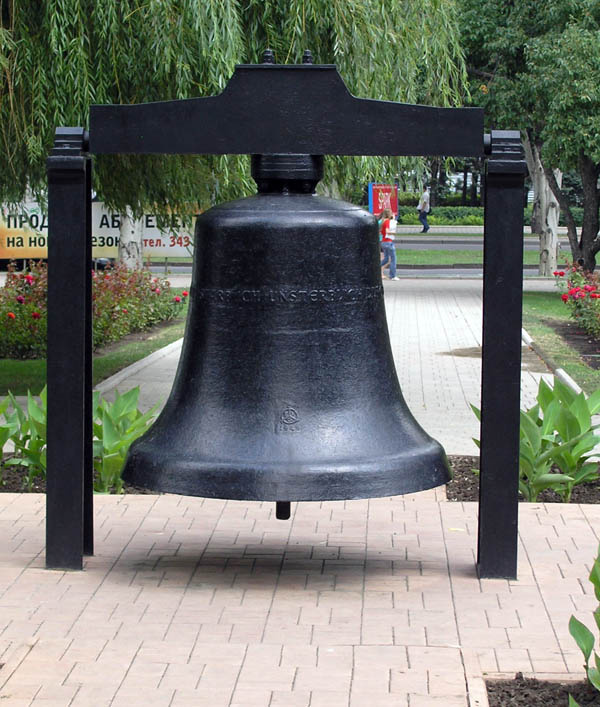 Бохумский колокол. Отлит в Германии в 1949. Установлен у здания горисполкома в 1997. Копия одного из трех колоколов, отлитых в 1851 году и победившие на парижской выставке в 1867. Эти колокола стали причиной вражды между Круппом и Майером, оспаривавших первенство в фасонном литье стали. Временную победу одержал распиаренный богатей Альфред Крупп из Эссена, который умело пользовался деньгами и связями , но история показала, что первым был таки не менее богатый, но много более порядочный Майер из Бохума - города-побратима Донецка - где в середине XIX века была впервые получена литая германская сталь.