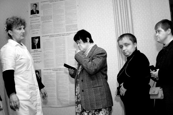 Пациенты психоневрологического диспансера, больные трисомией (синдром Дауна) участвуют в первом туре выборов президента Украины 2004.